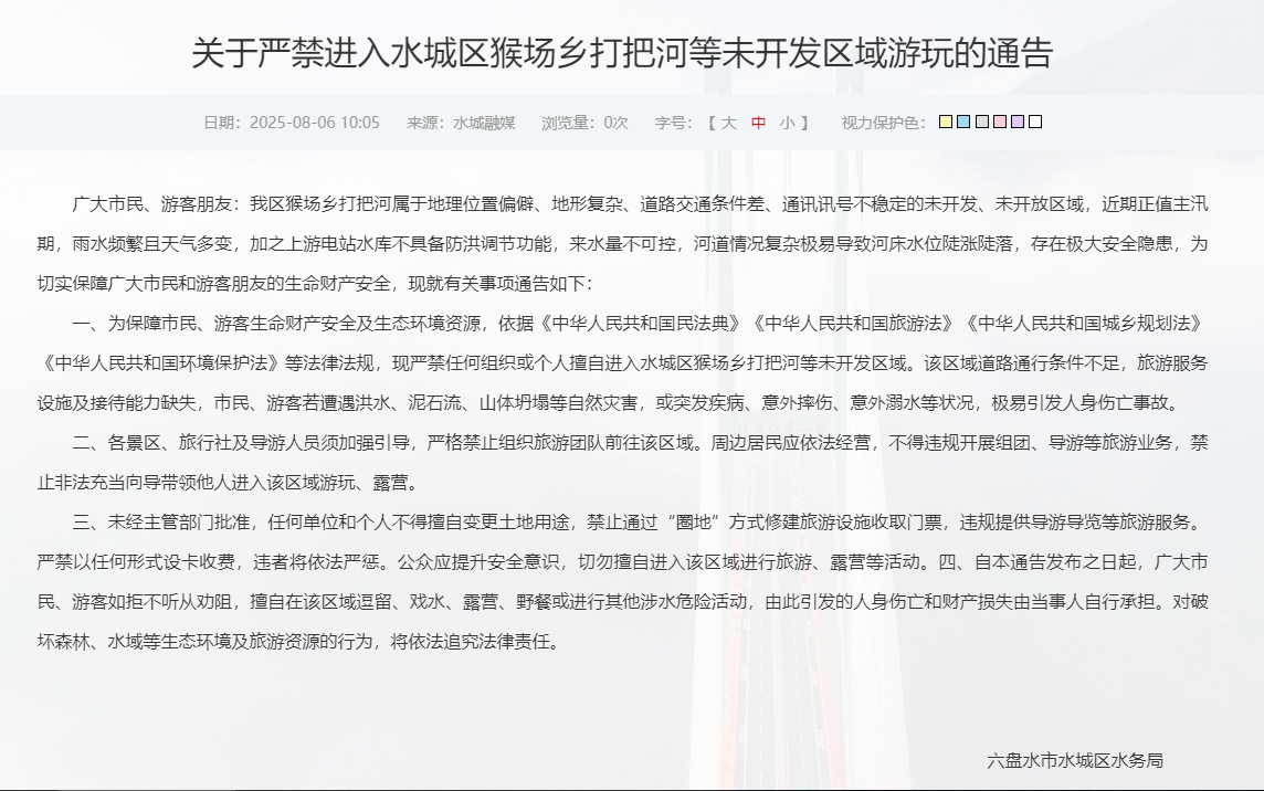 案例三:2025年6月30日,两名游客自驾前往贵州六盘水蟠龙镇一河边露营时,遭遇强降雨引发的山洪,7月15日,救援人员在下游猴场乡的河中发现男子已遇难,女子至今失联。