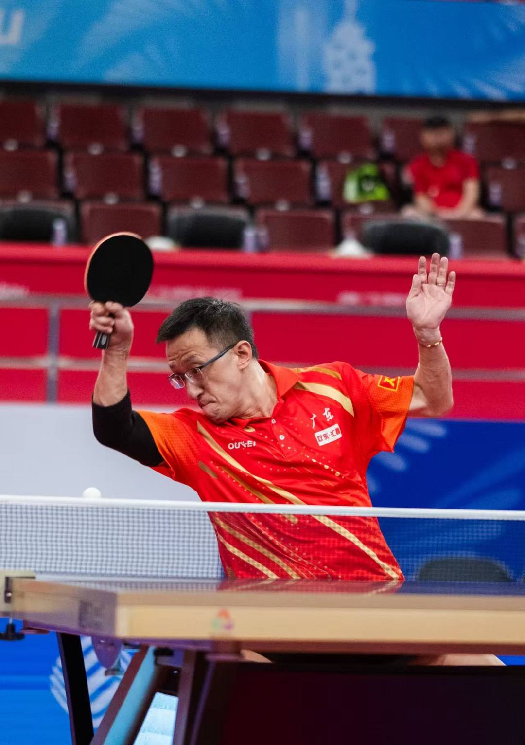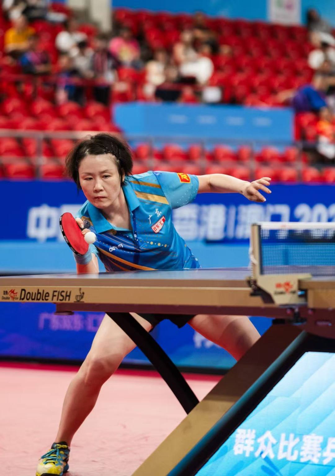 段妍是一名直板正胶选手,她告诉记者,她小时候的偶像是刘国梁,“刘国梁也是这种传统打法,我小时候就非常崇拜他,觉得他打得很好,所以一直以他为目标刻苦训练。”段妍曾是东莞的一位社区民警,现在虽然调到政务大厅,工作一直很忙,但这不妨碍她坚持乒乓球训练。她说,“我每天下午5点半下班,7点半要接孩子,我就卡着这个时间段去训练。这样都不耽误,我真的很热爱乒乓球。”这是段妍连续第三届参加全运会群众乒乓球比赛,她说,“第一届团体赛拿了第6名,第二届代表公安民警组拿到了团体赛亚军,希望本届全运会能够有所突破,拿一个冠军。”