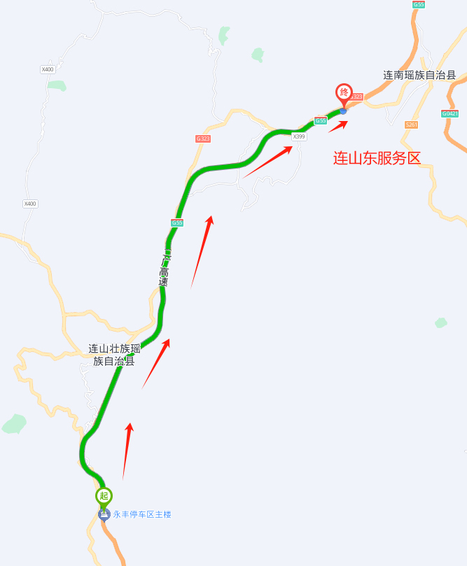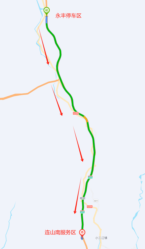 绕行路线:全封闭交通管制期间,永丰停车区将停止对外服务。二广高速往广州方向需停车休息、充电的司乘人员,请继续行驶至二广高速连山南服务区(距永丰停车区23公里)停靠休息、充电。