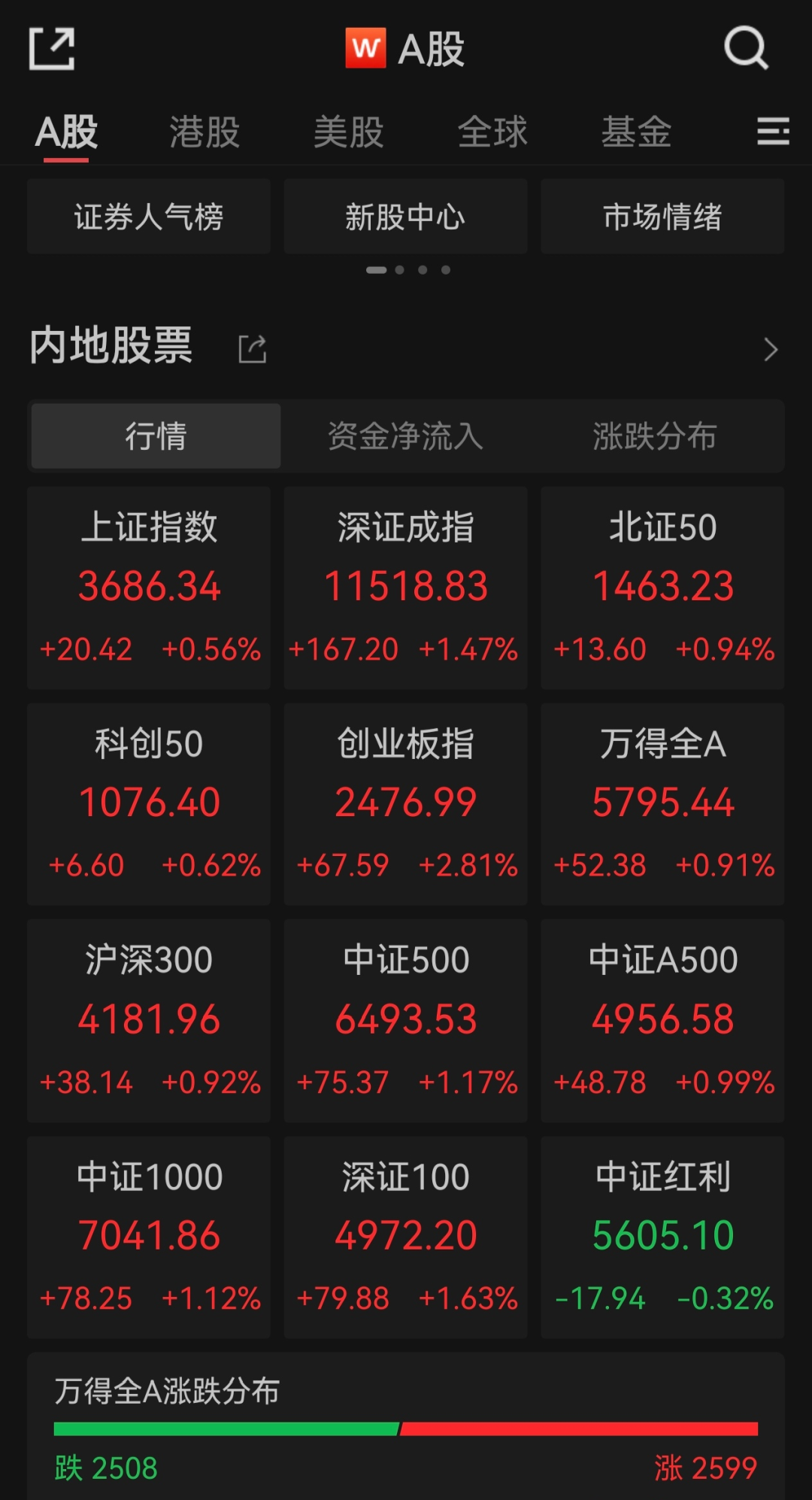 截至午盘,上证指数涨0.56%报3686.34点,深证成指涨1.47%,创业板指涨2.81%。A股半日成交1.33万亿元。