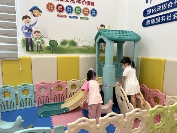 走进政务中心的大门,左手边一隅便是专为儿童打造的活动区域,这里配有安全地垫、滑梯、积木、绘本等儿童用品。为保障幼儿安全和现场秩序,中心设置了温馨提示牌并每日安排专人定时巡查该区域,致力于打造让“家长无忧办事,孩子快乐玩耍”的“童真空间”。如家长因办事无法看护小朋友,可以联系工作人员进行临时看护。除此之外,中心二楼还设有母婴室,携带婴儿孩童的办事家长可按需使用,也可联系志愿者协助看护。