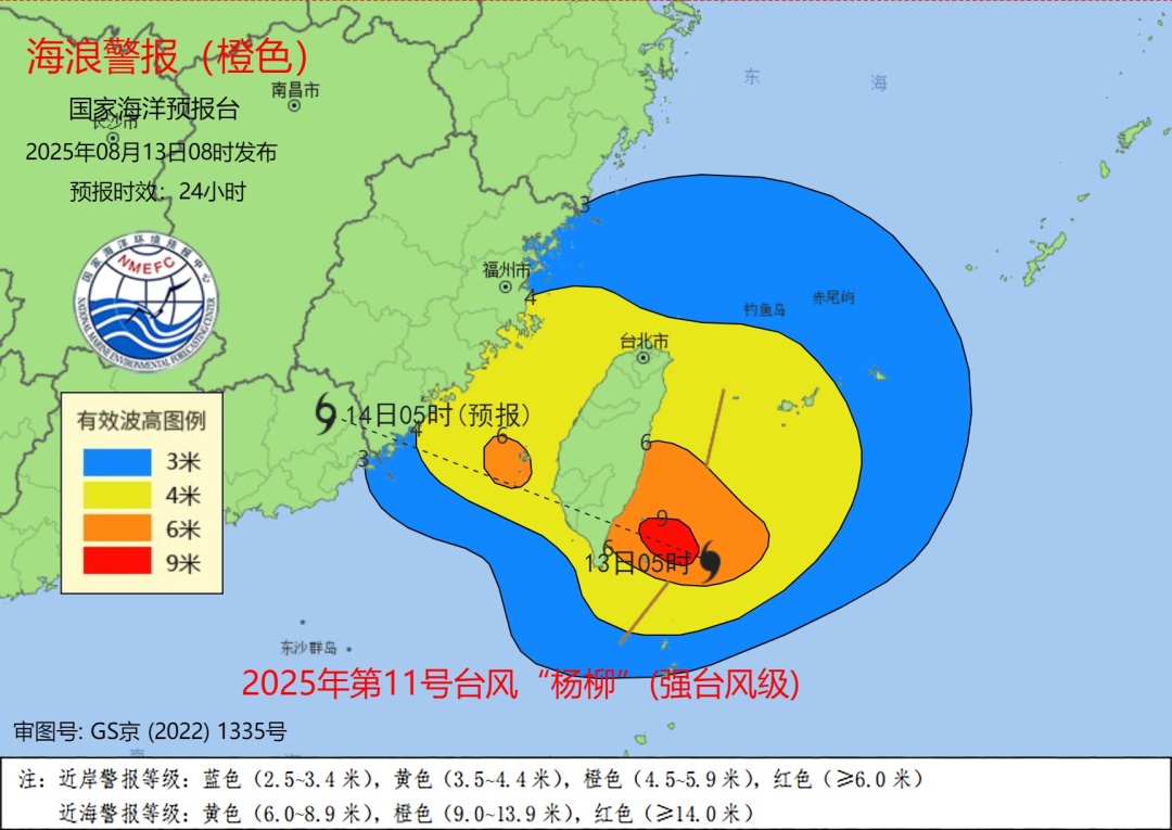 记者从自然资源部获悉,台风“杨柳”即将于13日中午前后在台湾东南部沿海登陆,受其影响,台湾以东洋面将出现6到9米的狂浪到狂涛,国家海洋预报台今天早上8时发布海浪橙色警报和风暴潮蓝色警报。