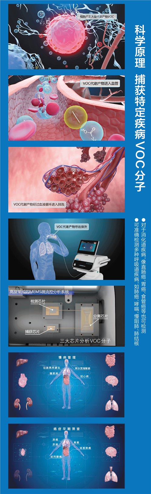 目前,科学家在人类呼气中已发现3600多种有机物分子,并证实部分疾病和患者体内代谢出的特定种类和数量的VOC分子直接相关。记者了解到,人类呼气代谢组学数据库中已罗列了超60种疾病及其强关联的特异性人类呼气VOC分子组合,且这一数量仍在不断增长。因此,若能精准检测这些VOC分子,就能为患者疾病诊断提供重要依据。