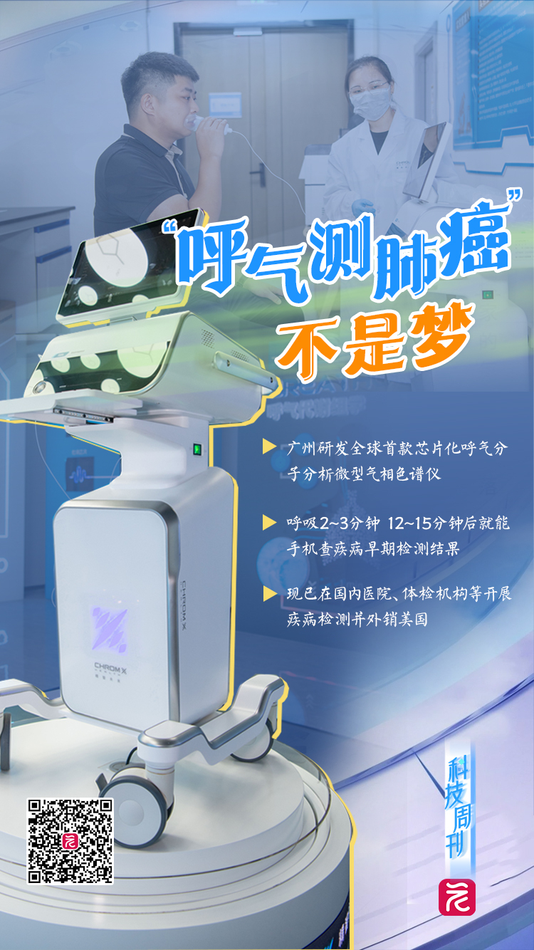 “呼气测肺癌”不是梦!呼气检测设备已经被广州一家科技企业生产了出来。这台全球首款芯片化呼气分子分析微型气相色谱仪,能精确检测人类呼气中的数千种VOC(挥发性有机化合物)分子,从而实现对肺癌、肺结节、慢阻肺、哮喘等疾病的早期检测。