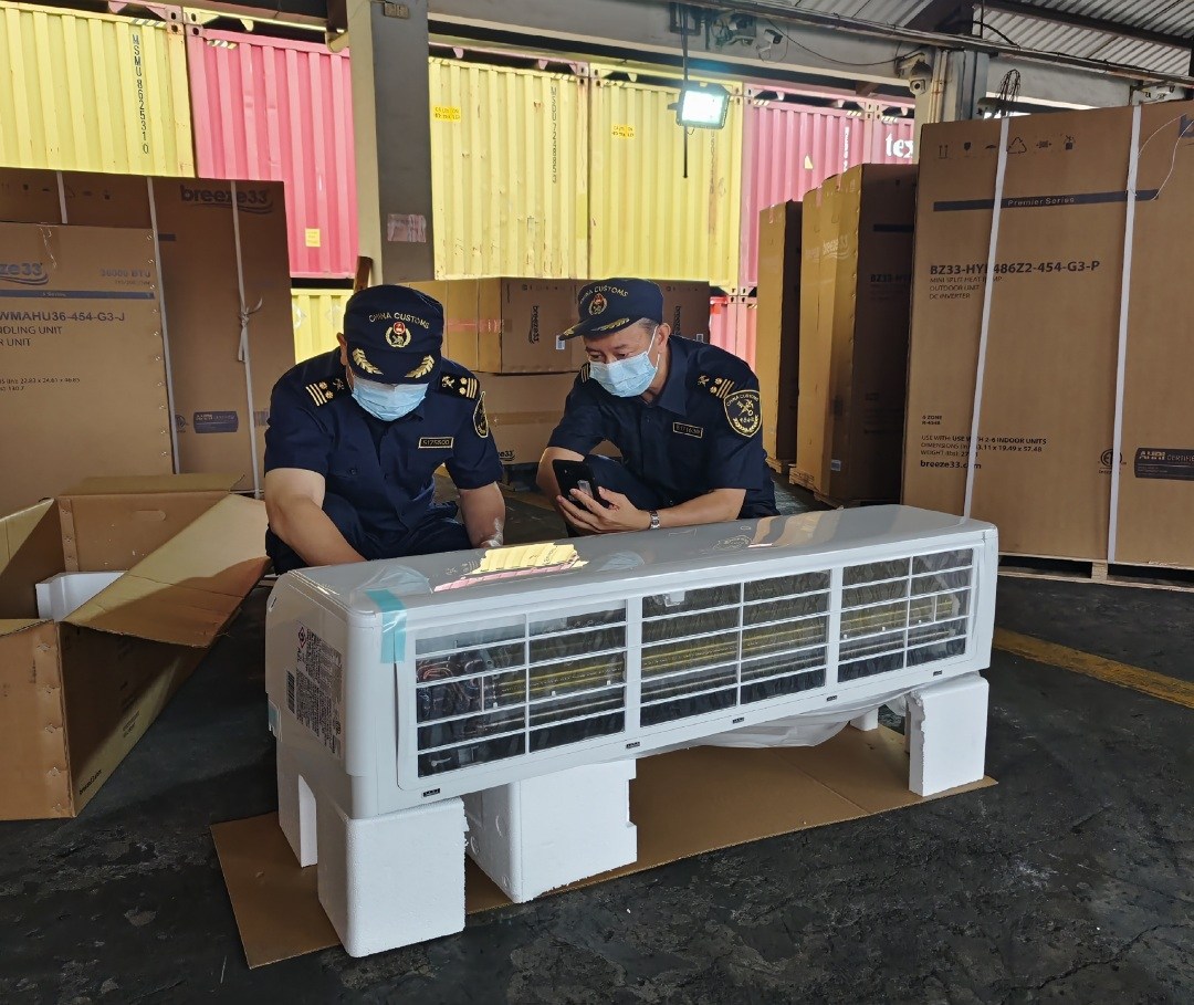 广州海关所属佛山海关关员对出口空调进行查验。