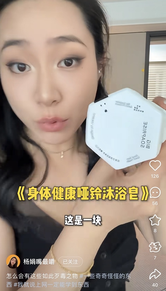 记者看到,“@杨娟嘴最嚼”分享了“身体健康哑铃沐浴皂”。这款产品将肥皂和健身两个不相干的元素强行结合起来,号称能让用户在洗澡时顺便健身。商家打出广告语——“洗澡的时间健身,肌肉层层增长”,让人不禁哑然失笑,难道消费者连洗澡的几分钟都要用来举铁?