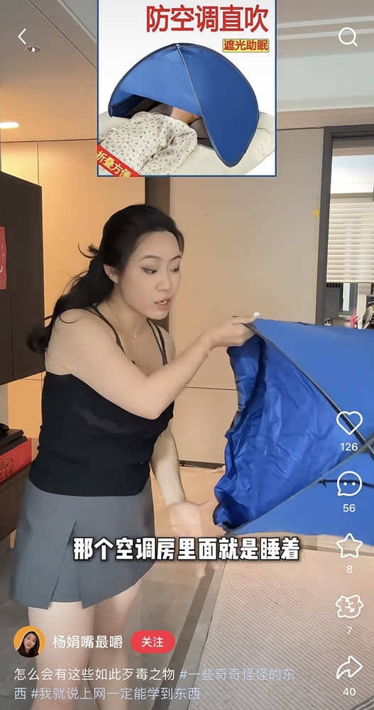 “@杨娟嘴最嚼”分享的“歹物”还有很多,比如为了避免空调直吹导致头痛,她购入了一款防空调直吹的小帐篷,但帐篷罩着头的画面怎么看都透着滑稽。对此,有网友也分享了自己的使用体验:“这个小帐篷对空调风还是有用的,就是外形有点太招摇了,如果是在办公室使用,就显得非常奇怪。”