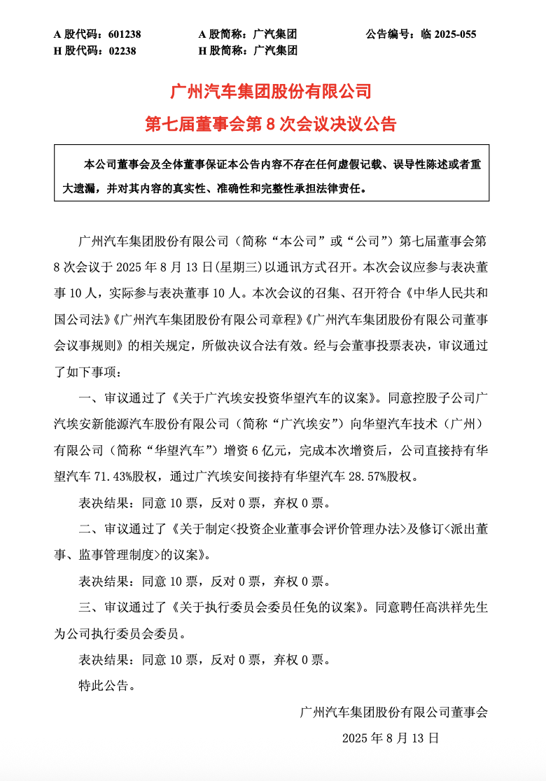 8月14日,广汽集团发布公告,第七届董事会第8次会议审议通过了《关于广汽埃安投资华望汽车的议案》。