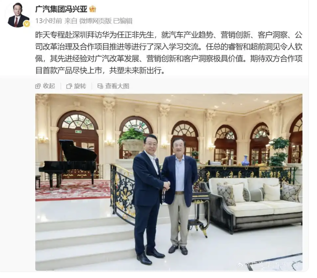 今年7月初,广汽集团董事长冯兴亚专程前往深圳,与华为创始人任正非会见。双方就汽车产业趋势、营销创新、客户洞察、公司改革治理及合作项目推进,展开交流。