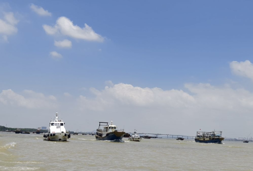 番禺区农业农村局派出渔政执法船及快艇组成执法编队,联合海事、海警等部门领航、护航渔船有序出海。