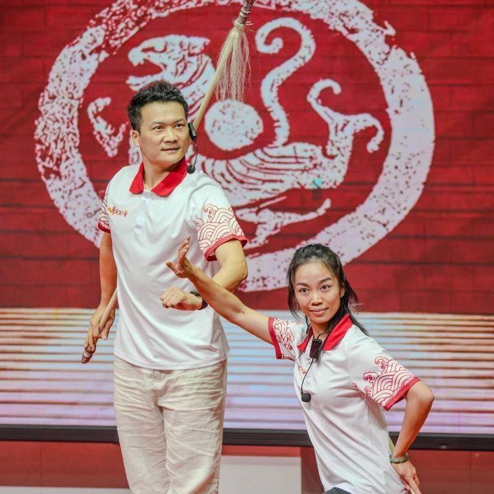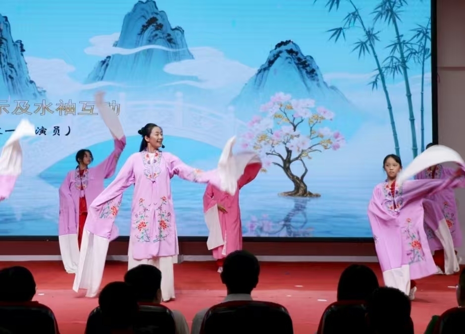 名家互动传匠心——刘建科的长剑身段组合刚劲洒脱,银剑翻飞间,小营员们争相上前讨教,一招一式学得有模有样;严金凤5尺长水袖行云流水,小营员们跟着甩袖、转袖,感受水袖里的千般情意;黄春强与莫伟英联袂演绎《穆桂英招亲》选段,翎子功、把子功惊艳亮相,随后的“把子互动”让小营员们亲身体验戏曲武打的飒爽。