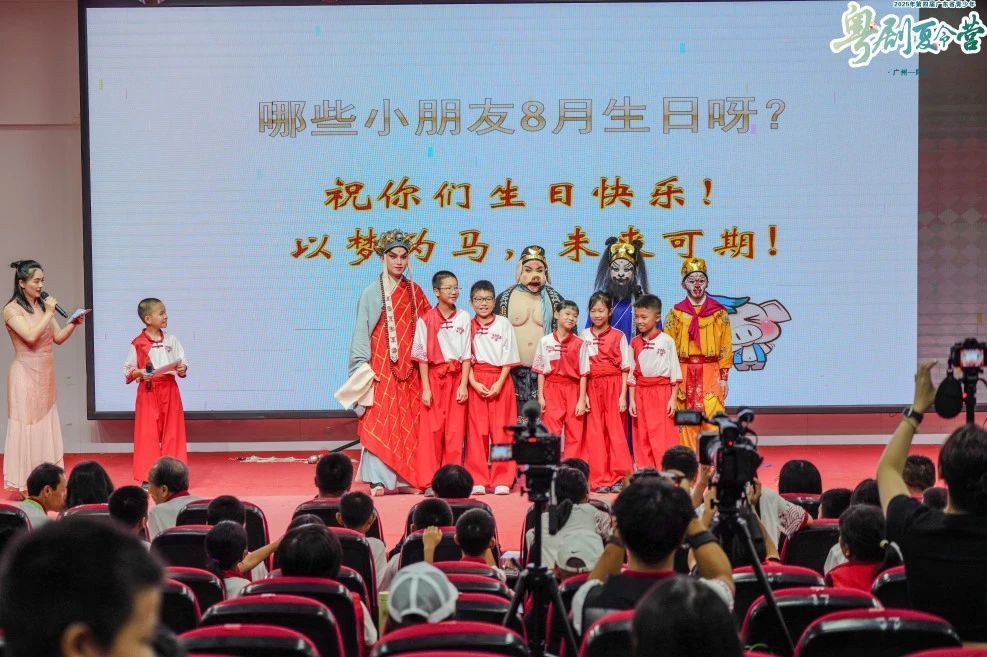 惊喜彩蛋燃温情——作为惊喜节目,粤剧《西游记》中的唐僧师徒登场,唐僧的儒雅、悟空的灵动、八戒的憨态、沙僧的沉稳,引得全场欢笑连连,与此同时,一场“惊喜生日会”悄然开启,蛋糕、歌声、祝福包围着夏令营里8月过生日的小寿星,让传承之路更添温情。