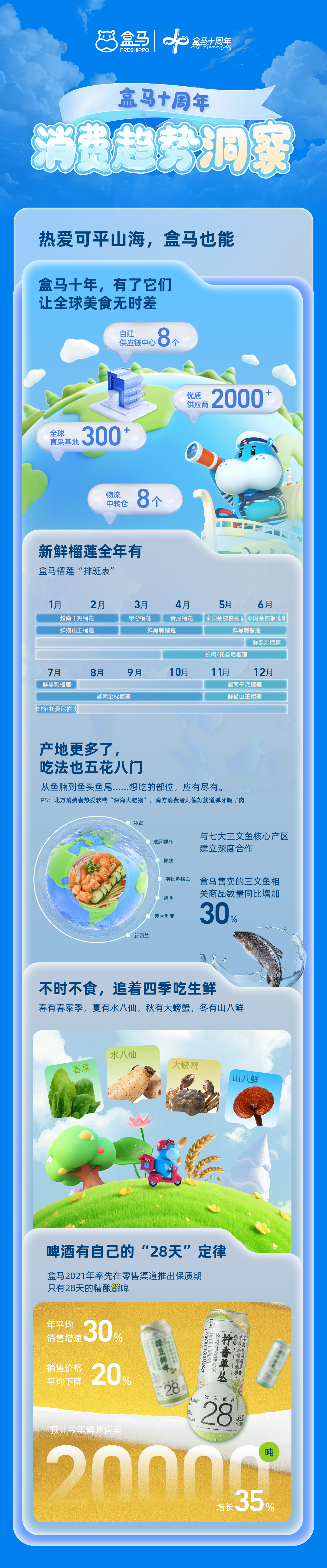 报告显示,过去10年间盒马已建成8个供应链中心、超300个直采基地、8个物流中转仓,遍布全国乃至延伸至海外的供应链网络。