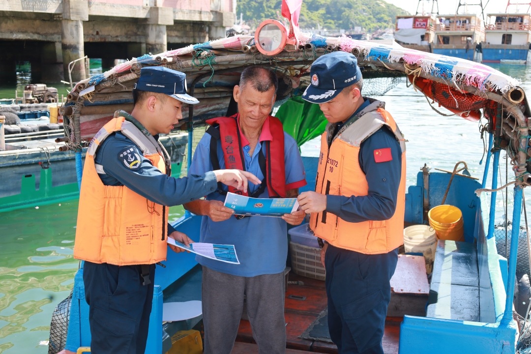 海警执法员从岸到海全面了解开渔前渔民的出航准备工作,登船仔细核查辖区渔船证书、普及航行避让规则、应急处置流程,引导渔民增强安全意识和法治观念,从源头上降低海上安全风险。