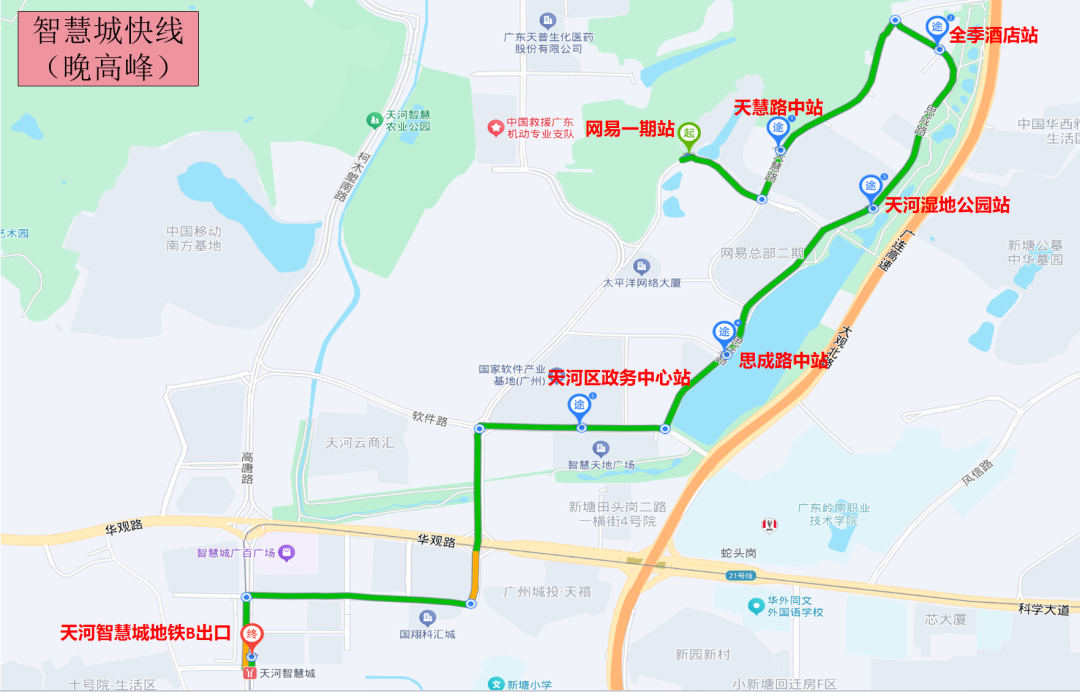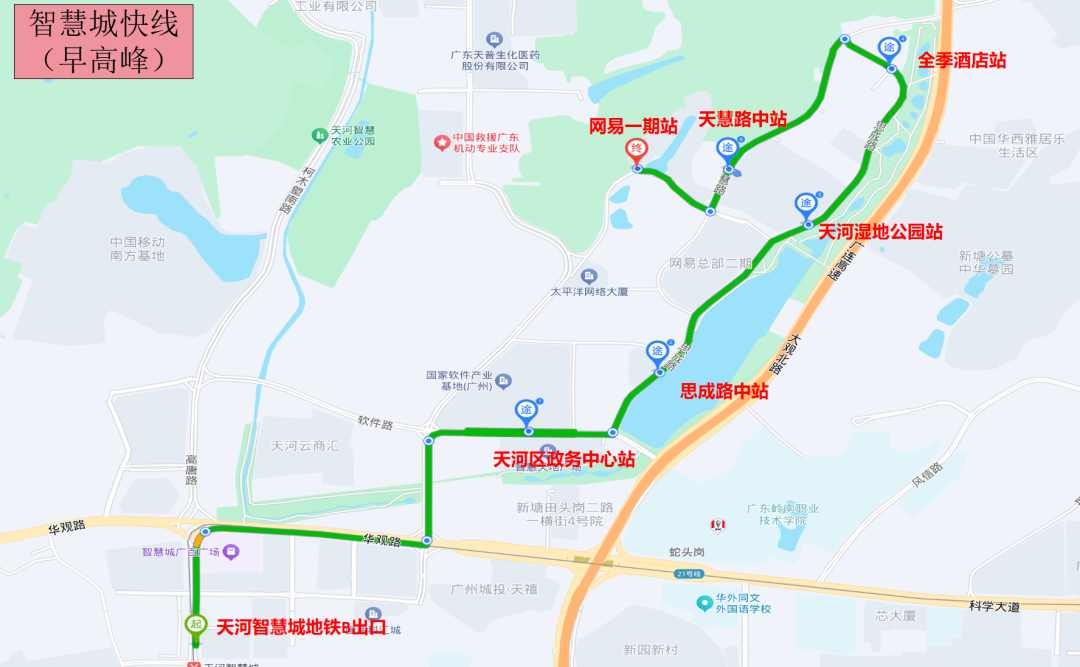 站点(早班):天河智慧城地铁B出口、天河区政务中心站、思成路中站、天河湿地公园站、全季酒店站、天慧路中站、网易一期站。(晚班从网易一期首发站反向发车)