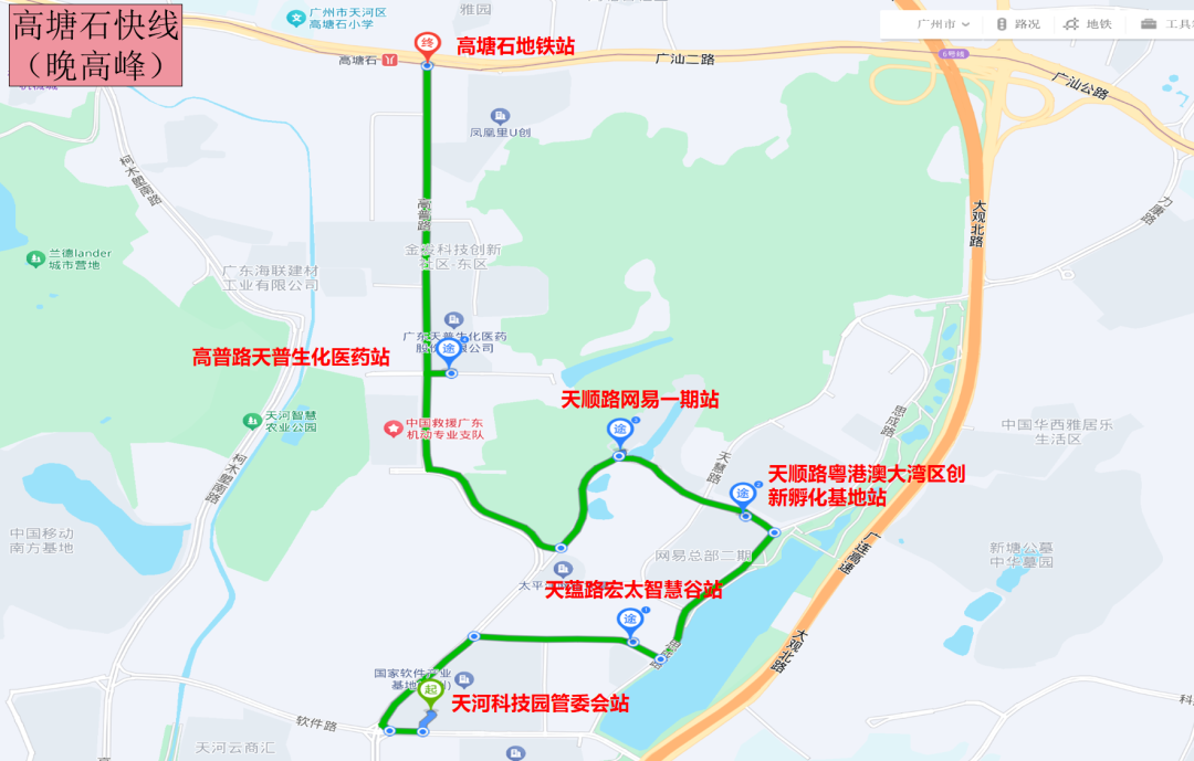 站点(晚班):天河科技园管委会站、天蕴路宏太智慧谷站、天顺路粤港澳大湾区创新孵化基地站、天顺路网易一期站、高普路天普生化医药站、高塘地铁站B出口。