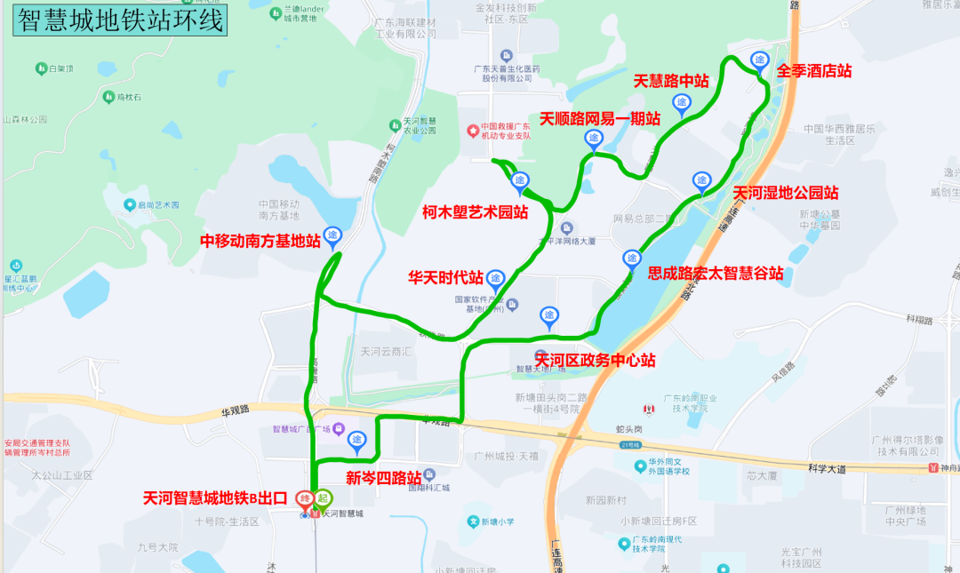 站点:天河智慧城地铁B出口(起点/终点)、新岑四路站、天河区政务中心站、思成路宏太智慧谷站、天河湿地公园站、全季酒店站、天慧路中站、天顺路网易一期站、柯木塱艺术园站、华天时代站、中移动南方基地站