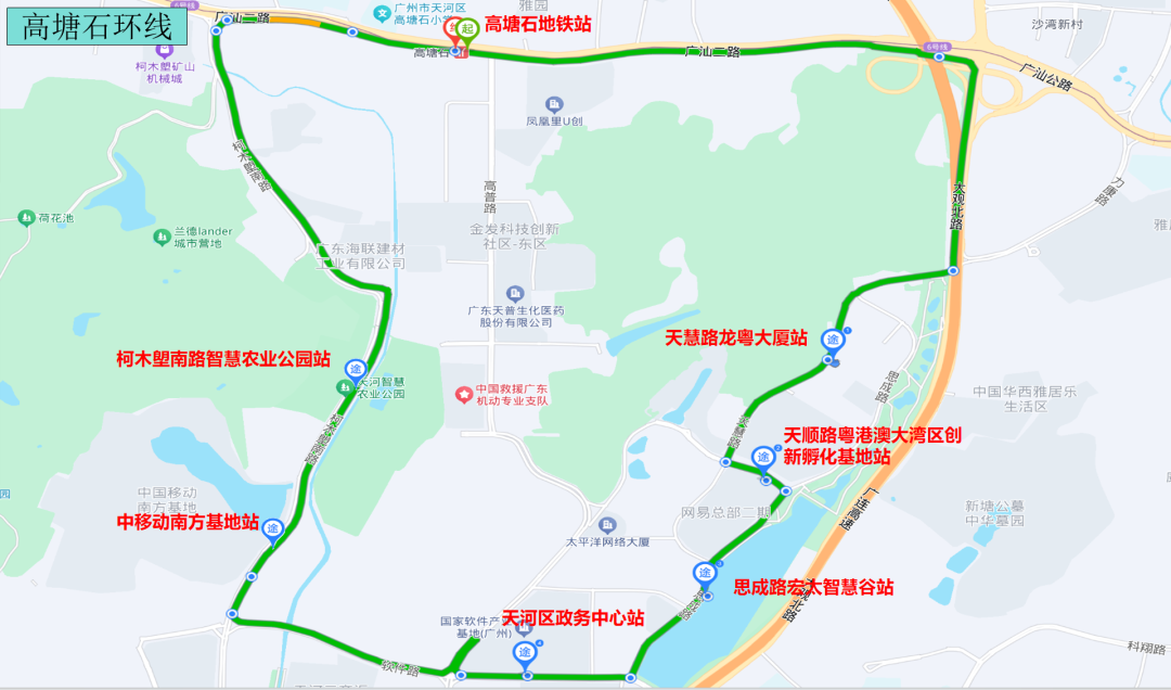 站点:高塘石地铁站、天慧路龙粤大厦站、天 顺路粤港澳大湾区创新孵化基地站、思成路宏太智慧谷站、天河区政务中心站、中移动南方基地站、柯木塱南路智慧农业公园站、广汕路高塘石地铁站。