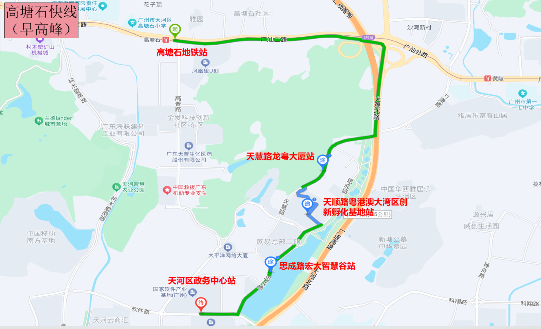 站点(早班):高塘石地铁站、天慧路龙粤大厦站、思成路宏太智慧谷站、粤港澳大湾区创新孵化基地站、天河科技园管委会站