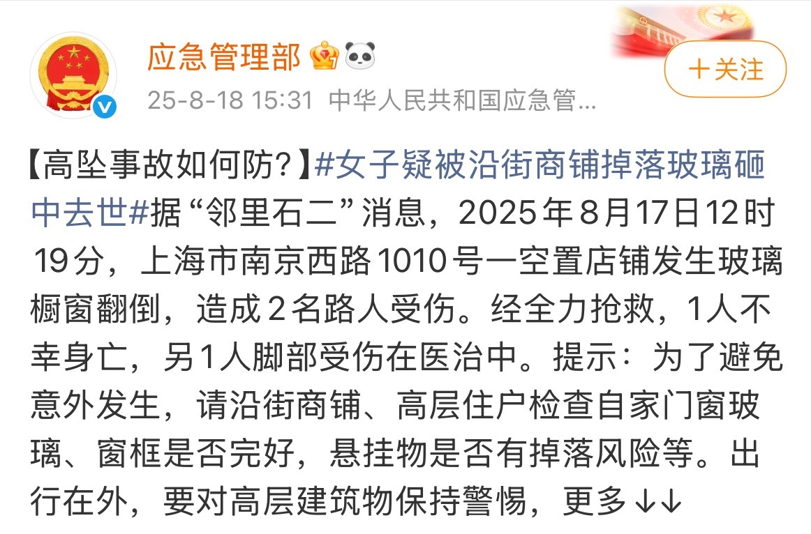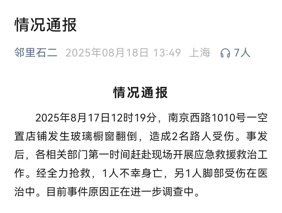《情况通报》称:2025年8月17日12时19分,南京西路1010号一空置店铺发生玻璃橱窗翻倒,造成2名路人受伤。事发后,各相关部门第一时间赶赴现场开展应急救援救治工作。经全力抢救,1人不幸身亡,另1人脚部受伤在医治中。目前事件原因正在进一步调查中。