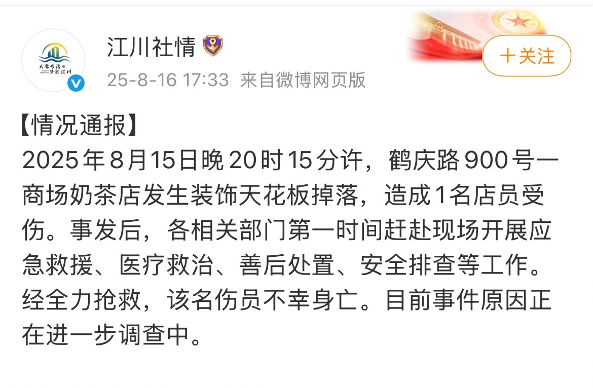 上海市闵行区江川路街道办事处通过官方微博发布《情况通报》。该《情况通报》称,2025年8月15日晚20时15分许,鹤庆路900号一商场奶茶店发生装饰天花板掉落,造成1名店员受伤。事发后,各相关部门第一时间赶赴现场开展应急救援、医疗救治、善后处置、安全排查等工作。经全力抢救,该名伤员不幸身亡。目前事件原因正在进一步调查中。