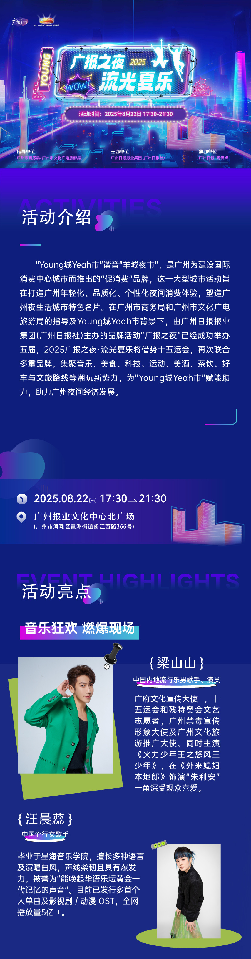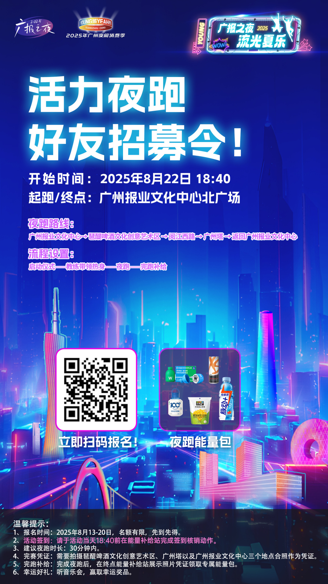 今年,恰逢“十五运”与广州相遇,紧扣人工智能的时代脉搏,在广州市商务局和广州市文化广电旅游局指导下,由广州日报报业集团(广州日报社)主办的2025“广报之夜·流光夏乐”活动将融合体育精神、人工智能互动与夜间消费,于8月22日(本周五)17:30~21:30,在广报中心北广场活力绽放。诚邀您共赴这场活力、智慧与美好的夏夜盛宴。