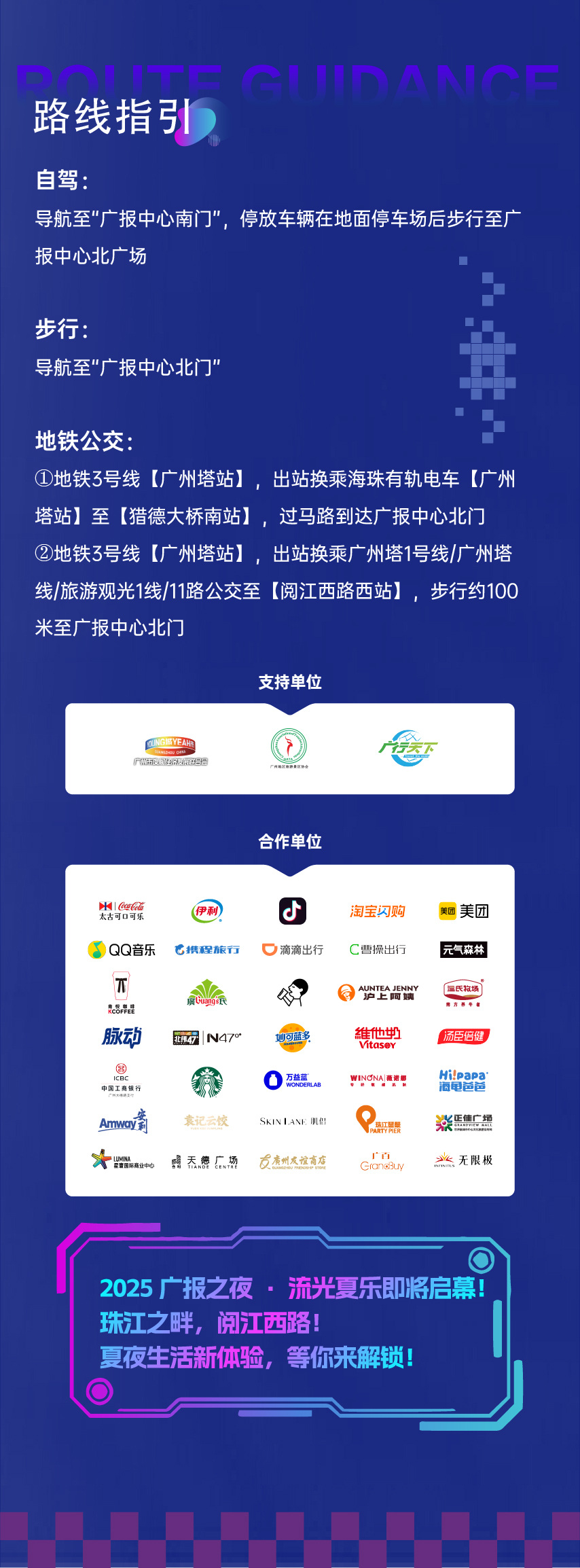 届时,启动仪式上,将发布主题视频片以及“广州夜间经济高质量发展·美好生活服务优秀案例”;联合广州地区旅游景区协会与广州市自驾游与房车营地协会共同推荐“羊城商旅文体夜间消费活力线路”;联合滴滴出行、淘宝闪购与携程共同发布2025夜间消费数据;联合滴滴出行、美团与淘宝闪购共同派发优惠券,买买买更优惠;联合QQ音乐发布2025“广报之夜”夜跑精选歌单等。