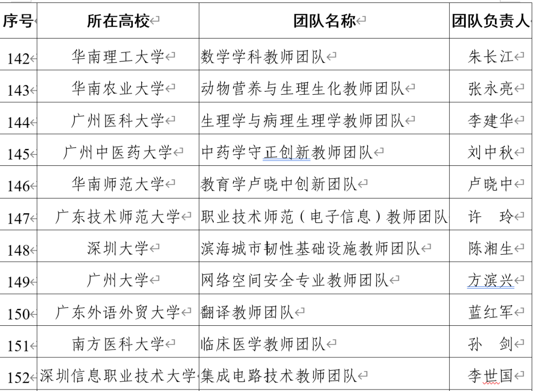 8月19日,教育部官网发布关于第四批“全国高校黄大年式教师团队”创建示范活动拟入围名单的公示。该批共有200所高校的团队入选,其中11所来自广东,包括10所普通本科学校及1所职业本科学校,分别是华南理工大学、华南农业大学、广州医科大学、广州中医药大学、华南师范大学、广东技术师范大学、深圳大学、广州大学、广东外语外贸大学、南方医科大学、深圳信息职业技术大学。