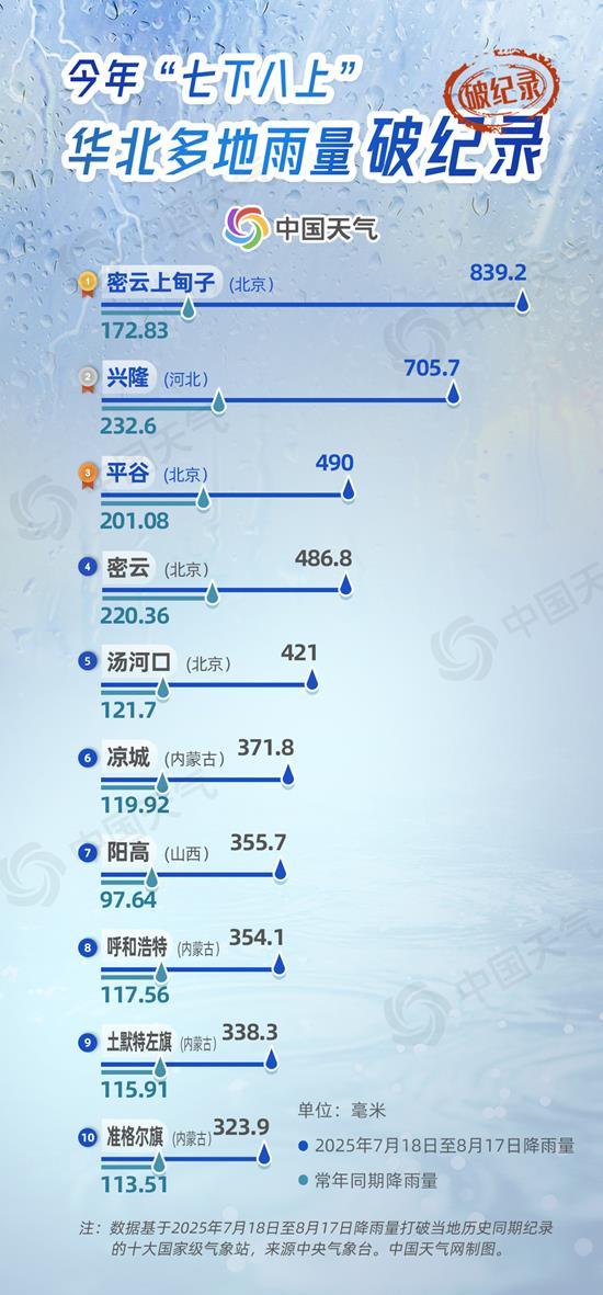 中国天气网统计的今年7月18日至8月17日北方降雨数据显示,华北等地共出现两次暴雨过程,大部地区累计降水量在100毫米以上。其中,内蒙古河套地区东部至山西北部、河北中北部、北京大部、天津北部累计降水量达250毫米以上,少数地区超过500毫米,降雨量最大的地方是北京密云上甸子,达839.2毫米。