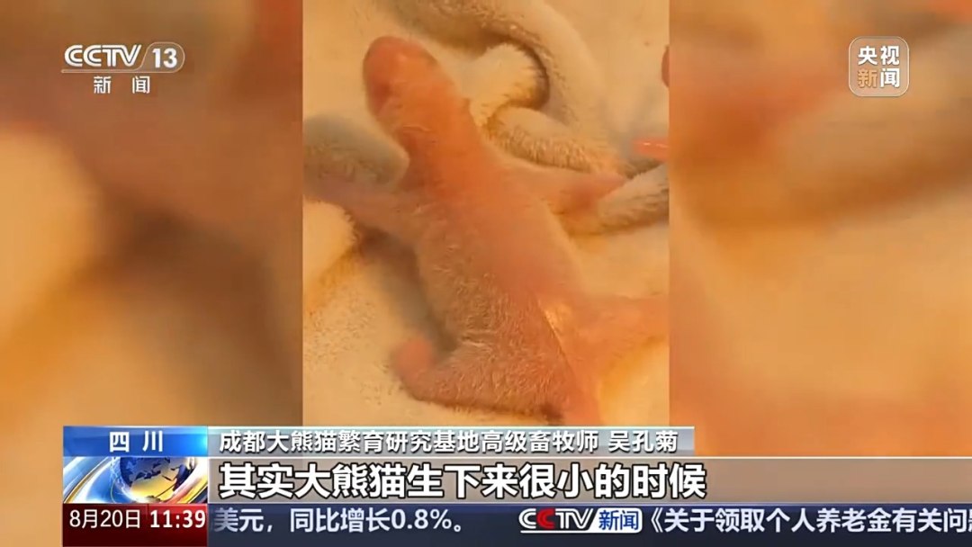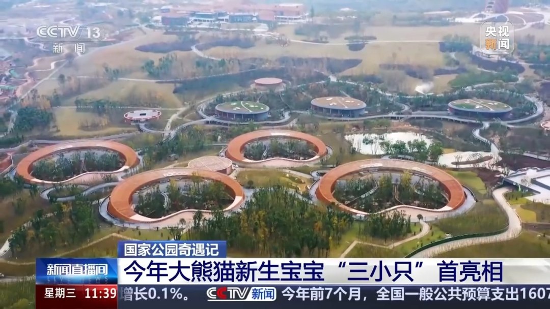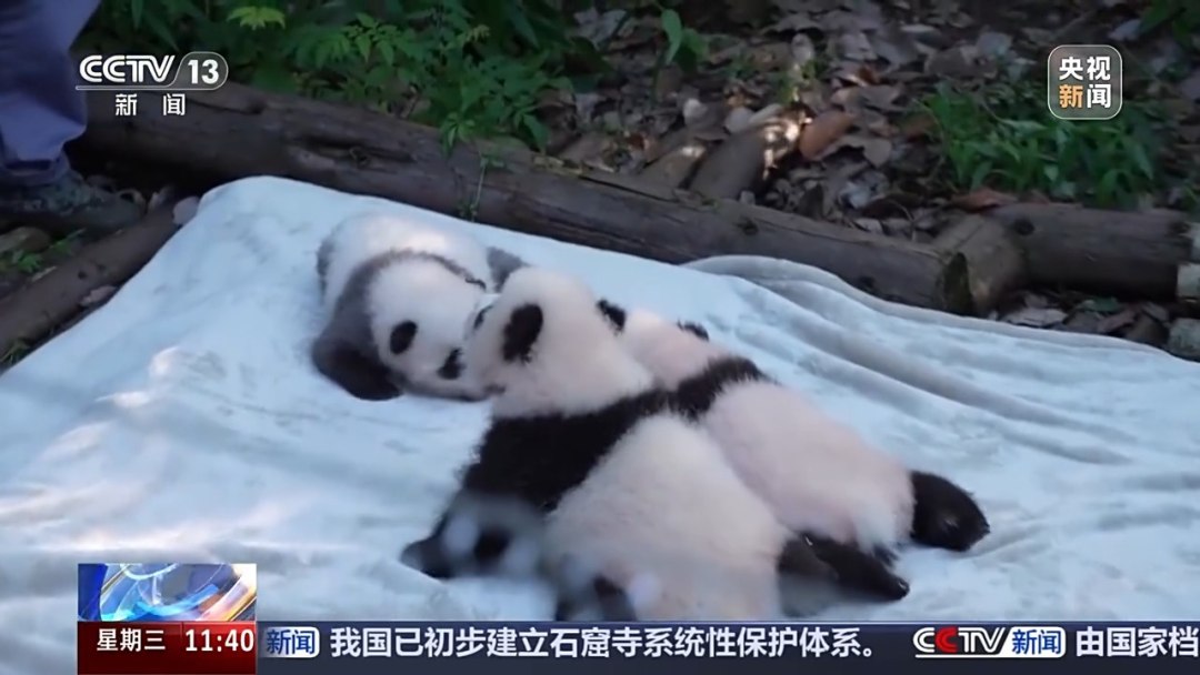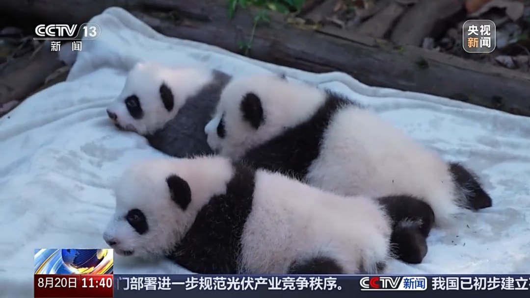 总台央视记者 蒋树林:在成都大熊猫繁育研究基地,今年新出生的三只大熊猫幼崽首次和全球观众见面。