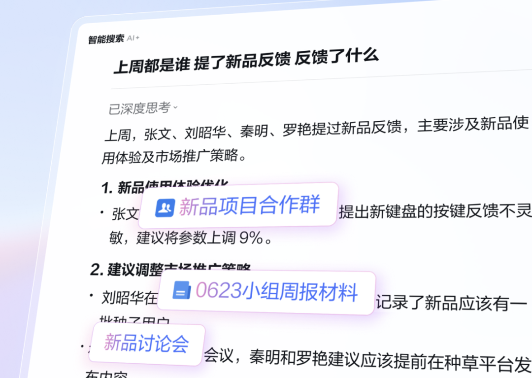 搜索作为办公场景中非常高频的一个需求,用户时常面临记忆、关键词模糊,信息量大且分散的问题,导致搜索效率和准确度非常低下。企业微信最新的智能搜索功能,借助AI能力,实现口语化提问,AI自动关联聊天、文档、会议、邮件等场景,精准定位文档最终版本,自动汇总数据等,让搜索这件事变得更加高效、准确。