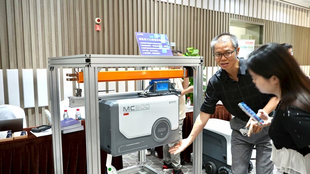 其中,在大型停车场柔性智能充电场景中,移动充电机器人为绿色出行提供着高效、可靠的补能保障。中科开创(广州)智能科技发展有限公司带来的挂轨式 V2G 移动充电机器人,能够解决配变不足情况下全车位的充电需求。