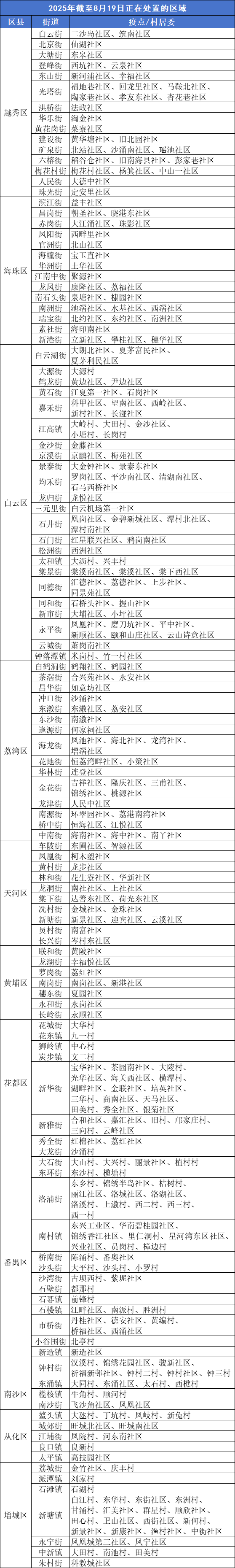 当前已进入登革热等蚊媒传染病流行季节。广州疾控提醒您,截至8月19日,以下区域正在开展蚊媒传染病疫情处置,存在传播风险,请注意防蚊灭蚊。