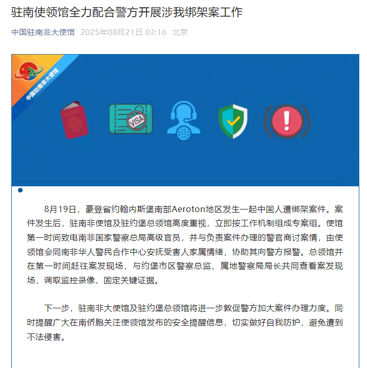 21日凌晨,我国驻南非使馆微信公众号更新,就中国人在南非遭绑架一案做出回应。