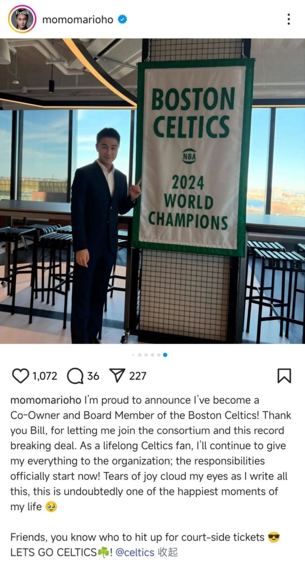 随后,何猷君在社交媒体写道:“我自豪地宣布,我已正式成为波士顿凯尔特人队的联合持有者及董事会成员。感谢奇泽姆让我加入这个创纪录交易的财团。作为终身凯尔特人球迷,我将继续为组织倾尽所有——这份责任此刻正式开启!书写这些文字时喜悦的泪水模糊了我的视线,这无疑是我人生中最幸福的时刻之一。”