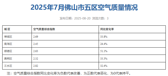 近日,佛山市生态环境局公布了今年7月佛山市五区空气质量情况。数据显示,五区的空气质量综合指数同比变化率均为正值,表明空气质量较去年同期有所恶化。