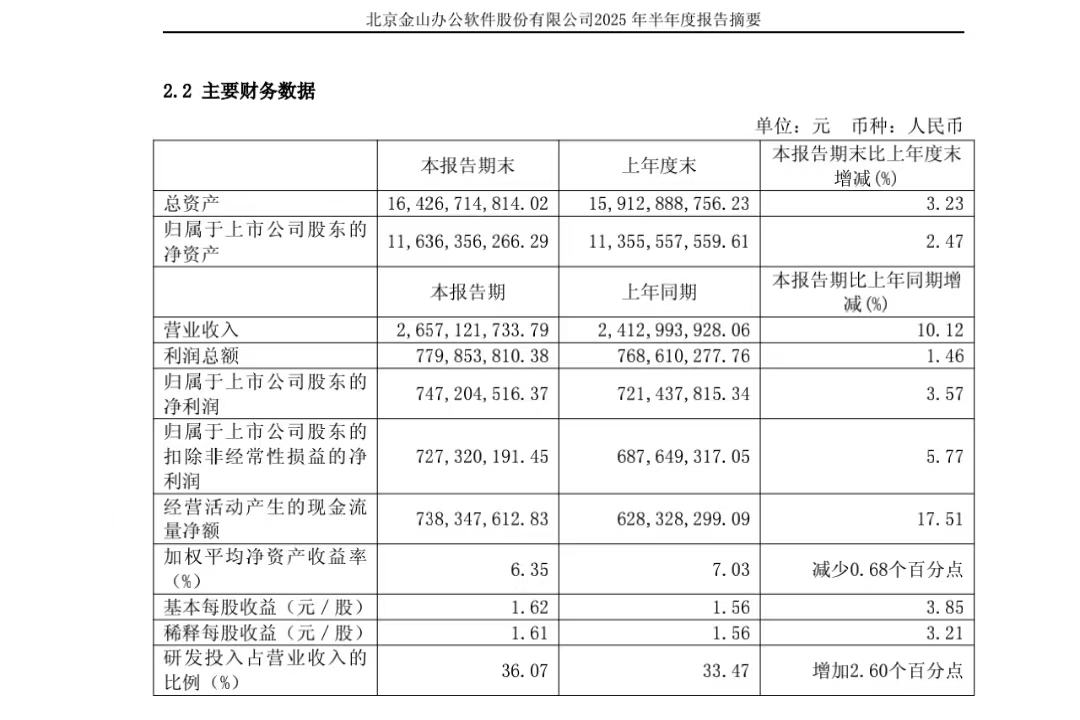 8月21日,金山办公(股票代码:688111)正式发布2025年半年报。数据显示,上半年金山办公实现营业收入26.57亿元,同比增长10.12%;归属于母公司所有者净利润7.47亿元,同比增长3.57%;归属于母公司所有者扣除非经常性损益净利润7.27亿元,同比增长5.77%。