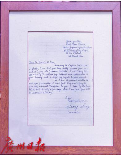 尘封81年的珍贵信件——归侨将军、东江纵队司令员曾生写给被营救的美国飞虎队唐纳德·克尔中尉的英文亲笔信。