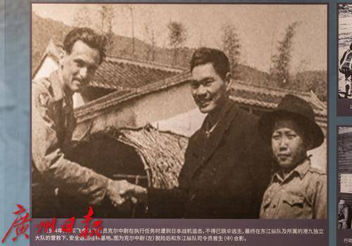 “万里同心”华侨抗战专题展上展示的1944年东江纵队司令员曾生与美国飞虎队唐纳德·克尔中尉的合影。