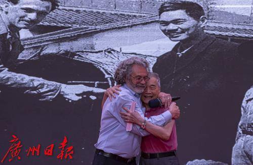 东江纵队司令员曾生之子曾德平和美国飞虎队飞行员唐纳德·克尔中尉之子戴维·克尔亲切拥抱在一起。