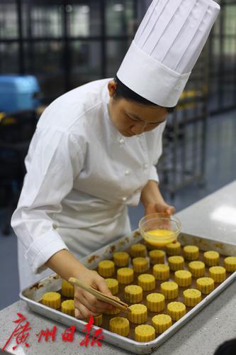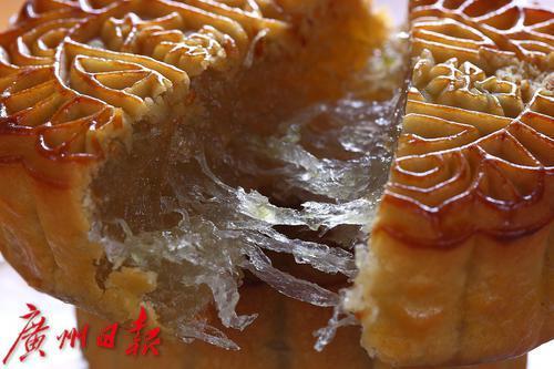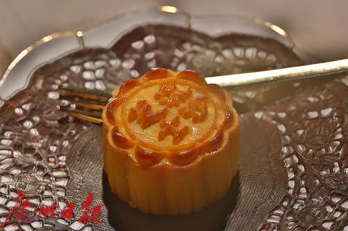 广式月饼以广州地区制作工艺和风味特色为代表的,采用糖浆、花生油、枧水等制成糖浆皮面团,馅料多用莲蓉、椰蓉、椰丝、豆蓉、蛋黄、果仁、糖腌肥猪肉等,重油、重糖,形态边角分明,花纹清晰,表面油润。