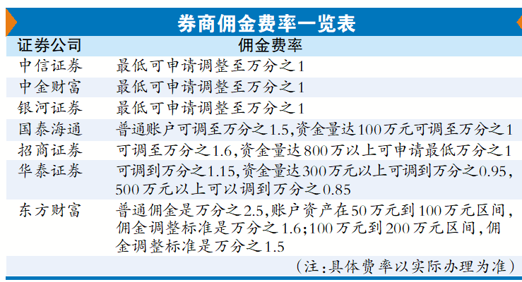 华泰证券甚至可破万分之1。其客户经理表示,新开户的佣金费率可调到万分之1.15,但如果资金量达到300万元以上可以调到万分之0.95,500万元以上可以调到万分之0.85。