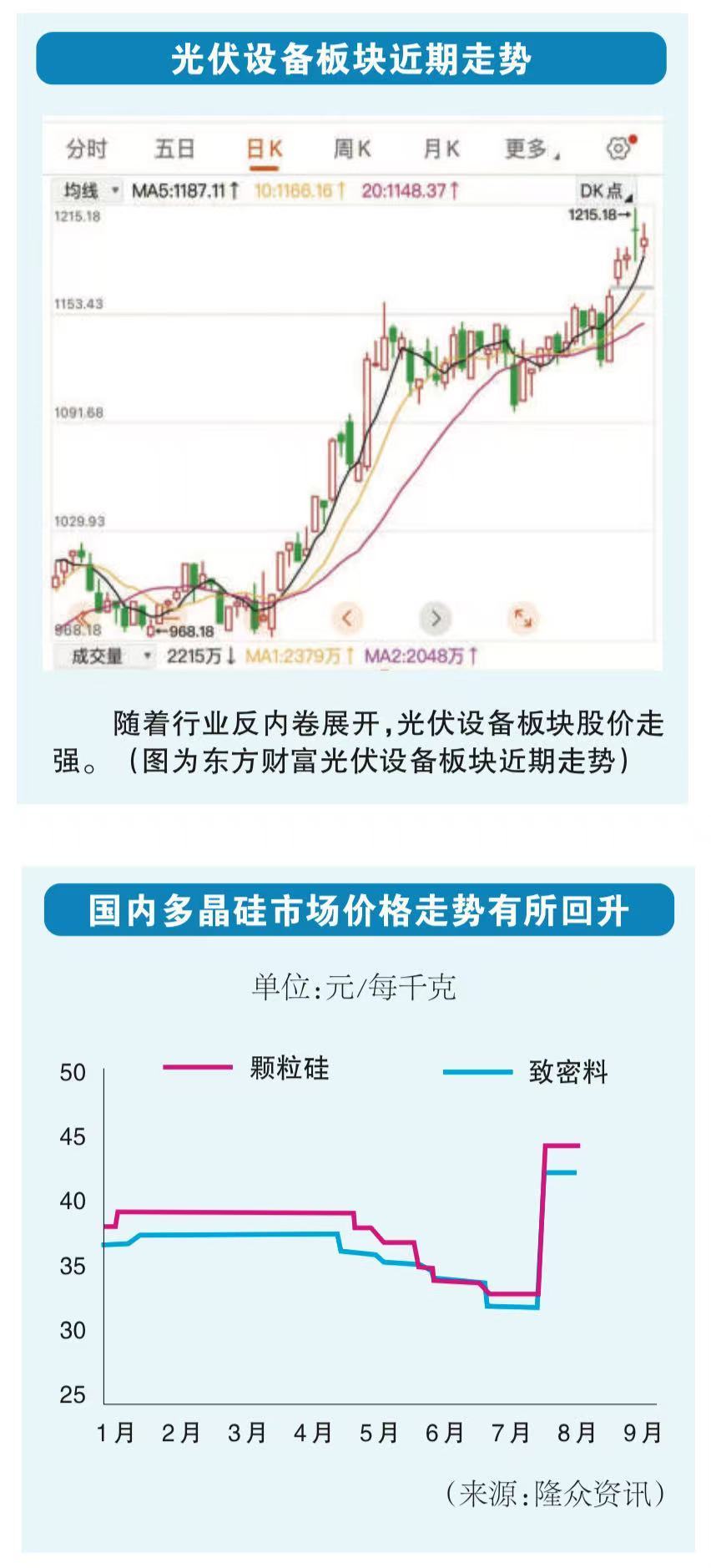 硅是光伏产品的上游原材料,其价格反弹是一个标志性现象:8月16日,中国有色金属工业协会硅业分会发布的数据显示,7月份之后,在国家“反内卷”政策的引导下,多晶硅和工业硅现货价格分别反弹至4.71万元/吨和9378元/吨,涨幅分别为36.9%和7.26%。