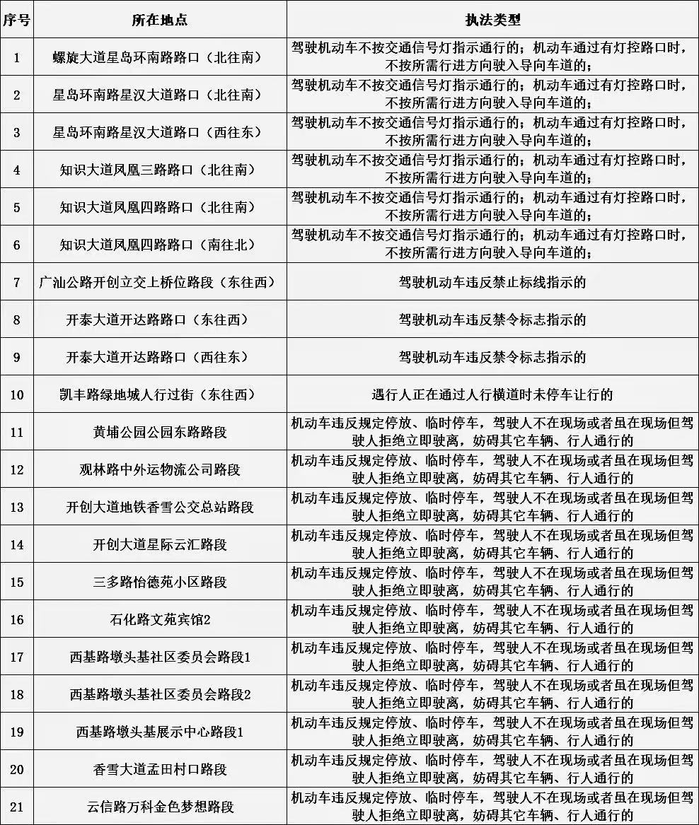 记者从广州黄埔警方获悉,为进一步加强辖区道路交通安全管理,规范道路交通通行秩序,保障人民群众的生命财产安全,交警部门将启用21套“电子警察”,相关地点涉及星岛环南路星汉大道路口、知识大道凤凰四路路口、开泰大道开达路路口等。