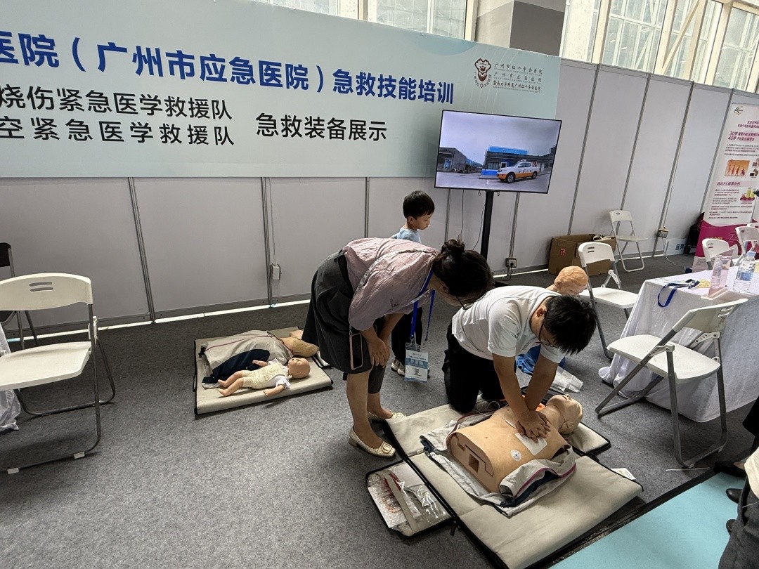 作为广州市应急医院,广州市红十字会医院在急救培训科普展位展示省级紧急医学救援队(广州市创伤烧伤紧急医学救援队、广州市航空紧急医学救援队)设备,通过"理论讲解+实操演示"模式向公众普及心肺复苏、创伤止血等急救知识。