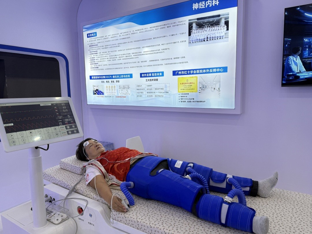 该展区重点介绍了体外反搏技术在脑血管疾病中的应用。作为国家标准化体外反搏中心,广州市红十字会医院率先将体外反搏技术应用于脑血管病治疗和康复。神经医学部主任范红星介绍,本次参加展会,希望可以寻找体外反搏项目的合作伙伴,共同开发更加智能化的体外反搏系统:实现智能化,通过监测身体多项指标,自动调节体外反搏参数;实现AI融合,通过病例数据库的深度学习,输出定制专病治疗模式,提高疾病适配性;实现与脑机接口相融合,使脑血管病患者脑血流和神经功能同步重建。