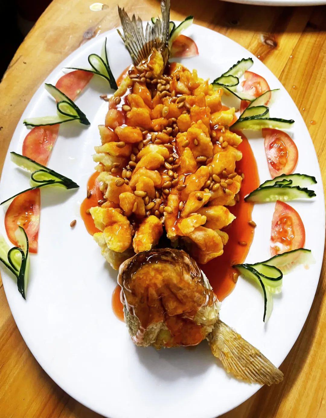 鱼塘自养鱼现捞现做绝对新鲜,大厨手起刀落,鱼肉改花刀,裹粉炸到金黄酥脆,最绝的是那勺秘制糖醋汁,酸甜开胃。