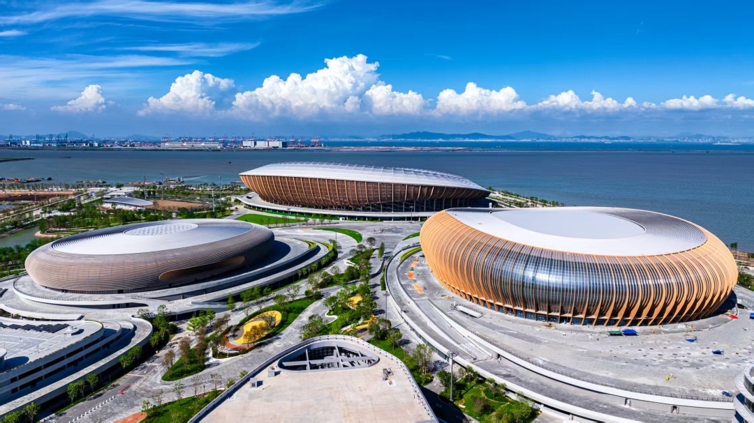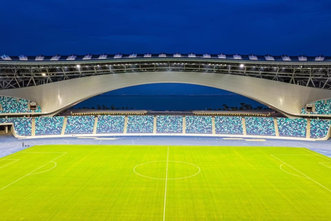 蓝白座椅如浪花翻涌,蓝色跑道似潮汐延伸,观众不仅能欣赏精彩赛事,还能在光影交错间“边看比赛边看海”。