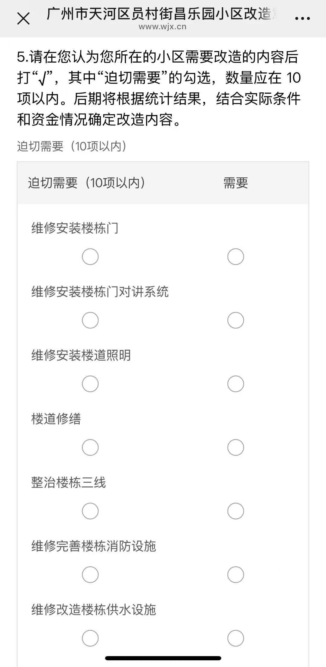 通知显示,业主可扫描二维码通过网络方式表达意愿,需从维修安装楼栋门、维修安装楼栋门对讲系统、维修安装楼道照明、楼道修缮等60项改造事项中勾选10项迫切需要的改造内容。