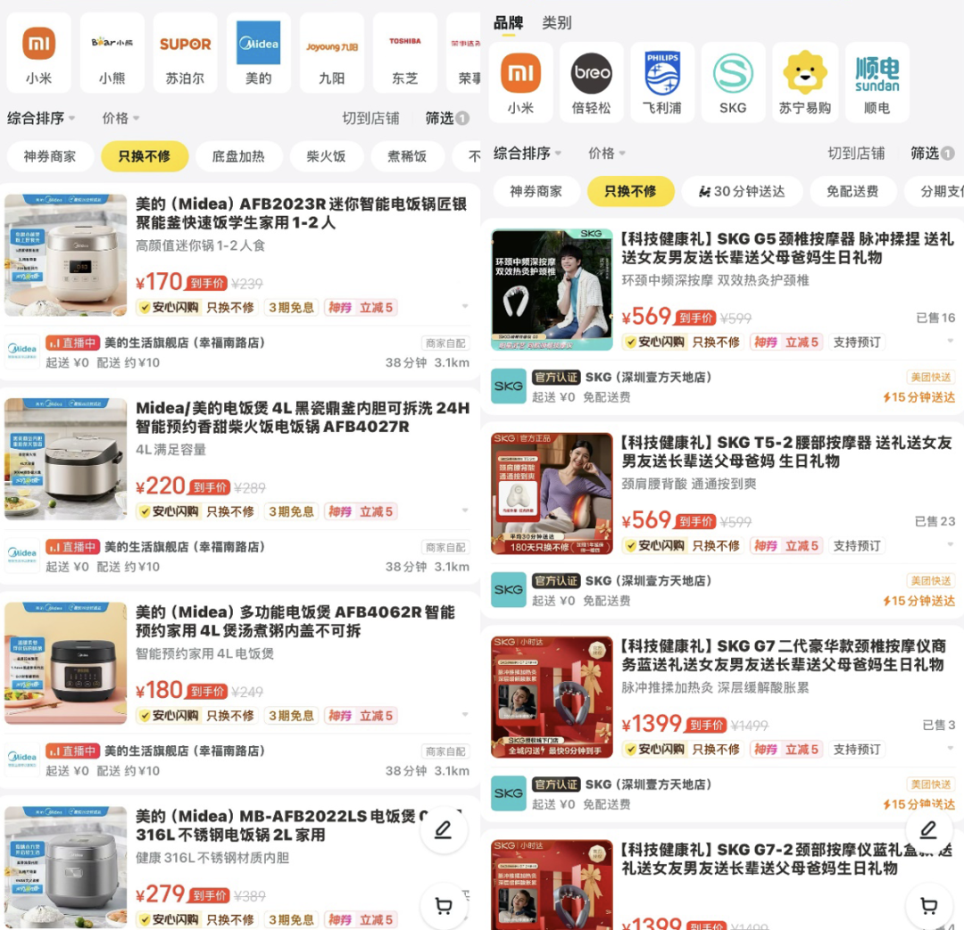 美团闪购方面表示,小家电售后长期存在“维修周期长”“退换流程繁琐”“翻新机流通隐患”等不佳体验。平台联合品牌实现“30分钟即买即用”加“最长365天只换不修”的小家电“安心闪购”体验,能够有效拉动品牌销售。今年第三季度以来,美的小家电“只换不修”服务上线美团闪购后,相关商品销量相比上季度增长8倍。